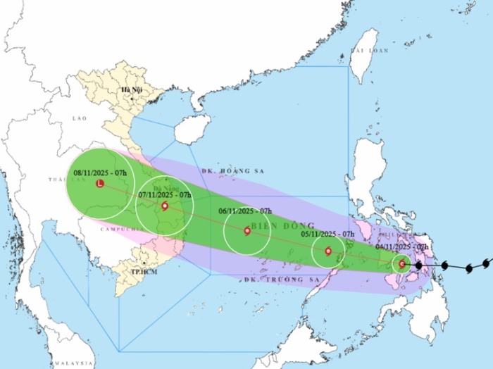 Theo dự báo của Trung tâm dự báo khí tượng thủy văn quốc gia, bão sẽ tiếp tục di chuyển theo hướng Tây Tây Bắc, sáng mai (ngày 5.11) sẽ di chuyển vào Biển Đông trở thành cơn bão thứ 13 hoạt động trên Biển Đông trong năm 2025. Sau khi vào Biển Đông tiếp tục mạnh lên cấp 13-14, giật cấp 16-17 và di chuyển hướng về vùng biển và đất liền khu vực Trung và Nam Trung Bộ nước ta. Bão có thể đạt tới cấp 13-14, giật cấp 16-17 ở đặc khu Trường Sa (Khánh Hòa) và trên vùng biển ngoài khơi từ Đà Nẵng đến Khánh Hòa; cấp 12-13, giật trên cấp 15 trên vùng biển ven bờ (bao gồm đặc khu Lý Sơn).