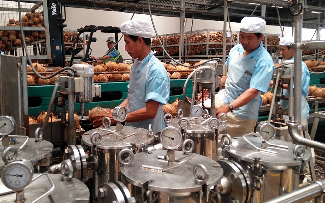 Dây chuyền xử lý dừa trái nguyên liệu trước khi đưa vào dây chuyền chế biến nước dừa đóng hộp. Ảnh: Tuyết Ân