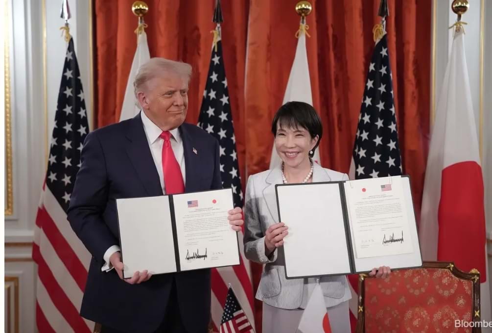 Tổng thống Mỹ Donald Trump và Thủ tướng Nhật Bản Sanae Takaichi (phải) cùng các văn kiện đã ký tại buổi lễ ở Tokyo. Ảnh Bloomberg