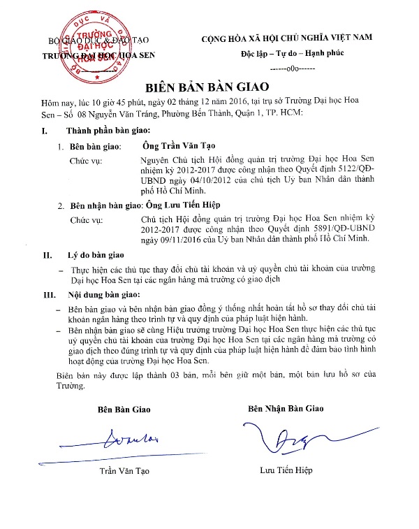 Theo các nguyên tắc làm việc cơ bản trên đây, hai bên đã thỏa thuận lập và ký vào các biên bản (Xem toàn văn biên bản lập lúc 10h45’ ngày 02.12.2016). Theo biên bản này, bên bàn giao và bên nhận bàn giao đồng ý thống nhất hoàn tất hồ sơ thay đổi chủ tài khoản ngân hàng theo trình tự và quy định của pháp luật hiện hành. Bên nhận bàn giao sẽ cùng Hiệu trưởng Trường Đại học Hoa Sen thực hiện các thủ tục ủy quyền chủ tài khoản của Trường Đại học Hoa Sen tại các ngân hàng mà trường có giao dịch theo đúng trình tự và quy định của pháp luật hiện hành để đảm bảo tình hình hoạt động của Trường Đại học Hoa Sen.