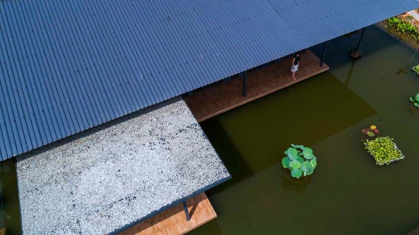 Từ thói quen ấy, kiến trúc sư đã đề xuất một khu uống trà nhỏ nằm giữa hồ, nơi mọi người có thể ngồi quây quần trong những lúc nông nhàn, giữa mặt nước và vườn cây xung quanh.