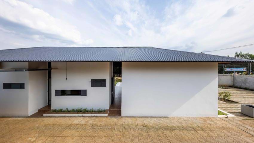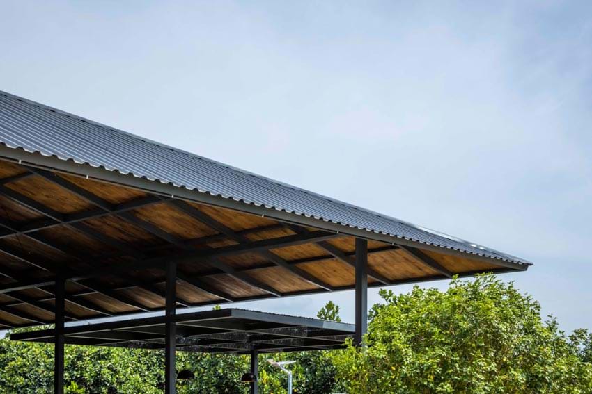 Các khối riêng tư vẫn được xây dựng bằng gạch theo phương pháp truyền thống. Tuy nhiên, phần không gian chung và hệ mái được thiết kế với khung thép tiền chế, mái tôn PU cách nhiệt và trần gỗ tự nhiên.