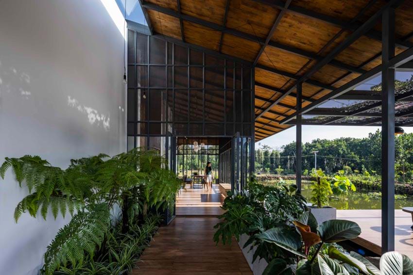 Hệ vách bao che của khu vực sinh hoạt chung sử dụng tổ hợp lưới sắt đột lỗ, khung thép và kính, giúp lấy gió, lấy sáng tự nhiên đồng thời vẫn giữ trọn tầm nhìn ra cảnh quan xung quanh. Mái nhà vươn dài về phía hồ nhằm giảm tác động của ánh nắng lên các mảng kính.