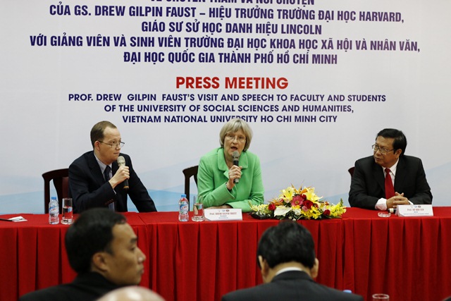 | "Sinh viên Việt Nam nhập học ở Harvard sẽ được xem xét bình đẳng với sinh viên Mỹ về cơ hội hỗ trợ tài chính, không phân biệt sinh viên nước ngoài hay sinh viên Mỹ", Hiệu trưởng Đại học Harvard khẳng định trong phần trả lời họp báo. Ảnh: Trung Dũng |