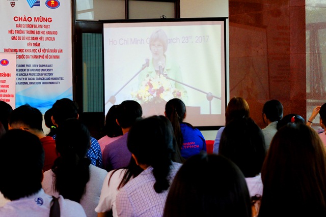 Sáng nay (23.3), trong khuôn khổ chuyến thăm và làm việc tại Việt Nam, Giáo sư Drew Gilpin Faust, Hiệu trưởng Đại học Harvard đã tới thăm và làm việc tại trường Đại học Khoa học Xã hội và Nhân văn - Đại học Quốc gia TP.HCM. Tại đây, ngoài việc thảo luận và bàn bạc về tiềm năng và những hướng quan trọng, ưu tiên hợp tác giữa hai đại học bà Drew Gilpin Faust cũng đã có bài thuyết trình với sinh viên và giảng viên của trường, với chủ đề "Cuộc chiến đã qua đi: Hồi ức và bài học lịch sử". Người Đô Thị Online giới thiệu toàn văn nội dung bài thuyết trình này, tựa bài do tòa soạn đặt.