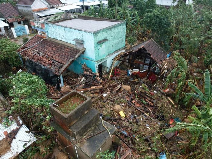Một góc thôn Mỹ Điền, xã Hòa Thịnh, tỉnh Đắk Lắk (thuộc huyện Tây Hòa, Phú Yên cũ) với nhiều căn nhà bị sập tường, trôi mái sau lũ, trong số hàng trăm nhà bị ảnh hưởng ở "rốn lũ" này. Ảnh: Vnexpress