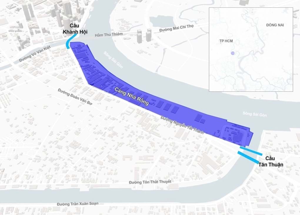 Vị trí cảng kéo dài từ cầu Khánh Hội đến cầu Tân Thuận. Đồ họa: Tâm Thảo/Vnexpress