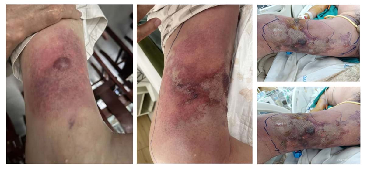 Tại thời điểm nhập viện, tình trạng bệnh nhân rất nghiêm trọng. Vùng đùi phải sưng to, căng tức, xuất hiện nhiều nốt phỏng nước chứa dịch màu nâu đen (phỏng nước xuất huyết). Đây là dấu hiệu điển hình của tổn thương mô sâu và hoại tử. Trên nền sẵn có cơ địa giảm miễn dịch, các bệnh mãn tính như gút và tăng huyết áp, tình trạng nhiễm trùng của bệnh nhân tiến triển càng nhanh.