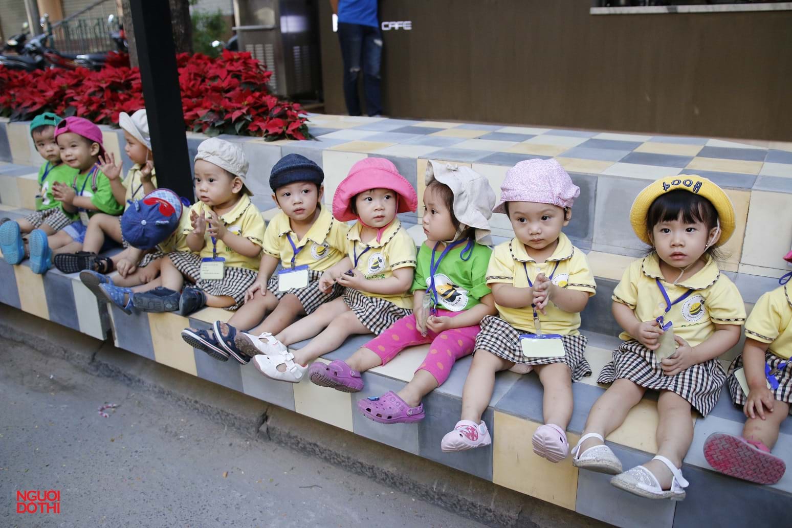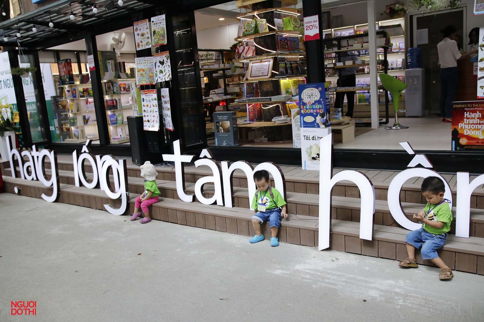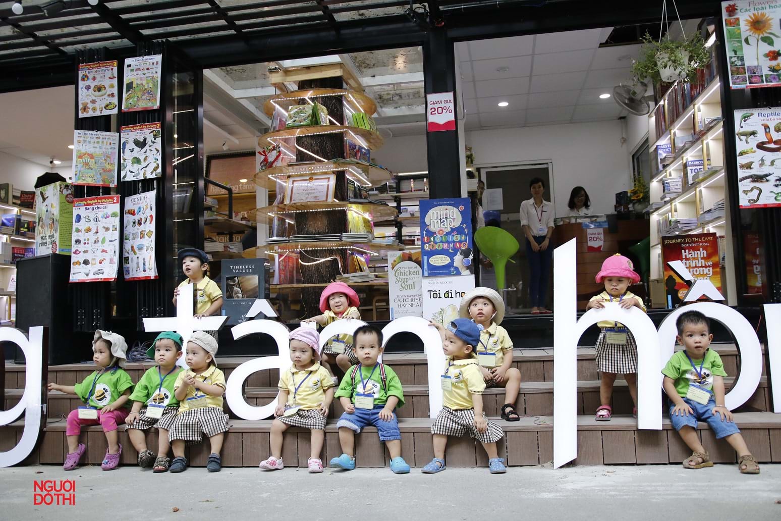 Các học sinh mầm non trong một buổi dã ngoại đã chọn Đường sách mới khai trương để tham quan. Trong ảnh, các bé chụp hình trước cửa hiệu của Công ty First News.