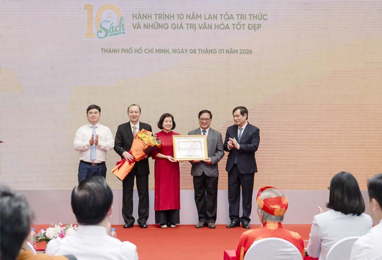 Ông Phan Xuân Thủy - Phó Trưởng Ban Tuyên giáo và Dân vận Trung ương và PGS-TS. Phạm Minh Tuấn - Phó Tổng Biên tập Tạp chí Cộng sản, Chủ tịch Hội Xuất bản Việt Nam, trao bằng khen cho Công ty TNHH Đường sách TP.HCM tại Lễ kỷ niệm 10 năm Đường sách TP.HCM diễn ra sáng ngày 8.1.2026.