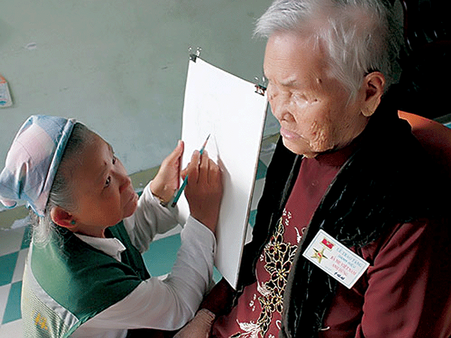 Họa sĩ Đặng Ái Việt đang vẽ chân dung một bà mẹ Việt Nam Anh hùng. Ảnh TL
