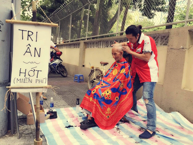 Lê Tuấn - hiện sinh sống và làm nghề cắt tóc tại bang Missouri (Mỹ) hớt tóc miễn phí trên đường Alexandre De Rhodes, quận 1. Ảnh Diên Vỹ