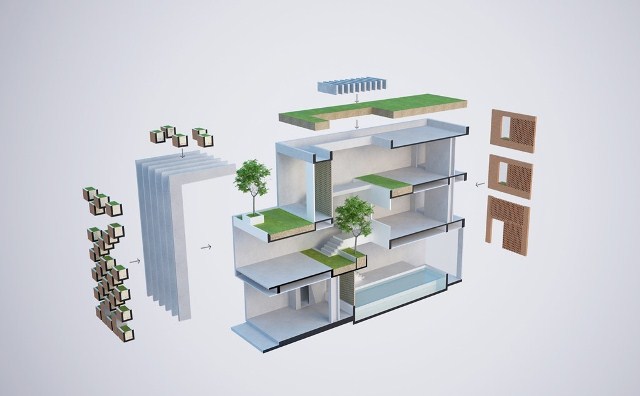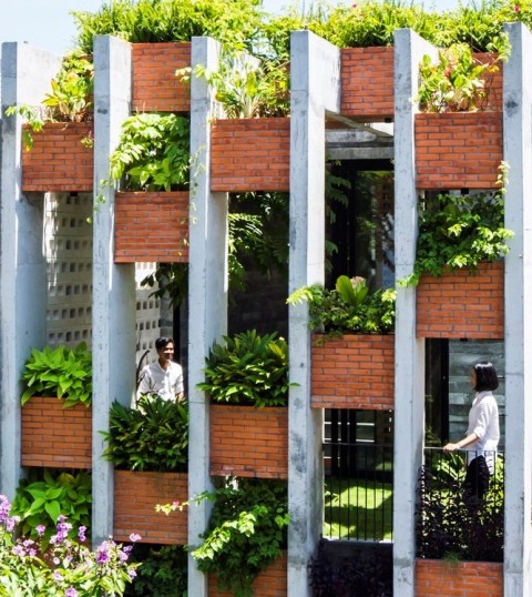 | Hình ảnh căn nhà với những "giỏ cây" từ bên ngoài. Phía trước là sảnh rộng. |