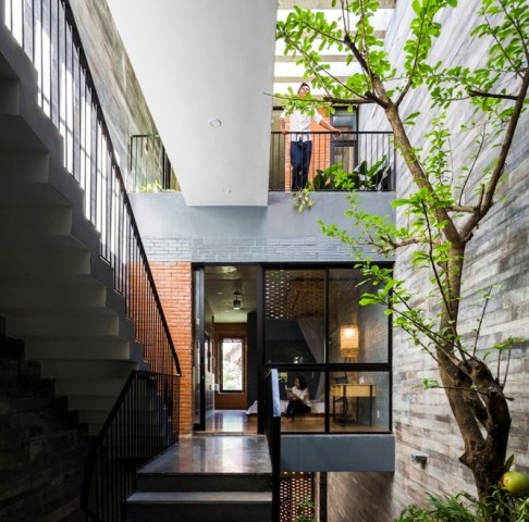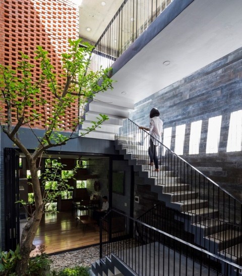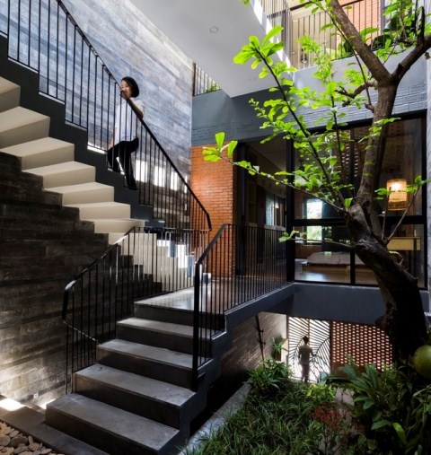 | Không gian trong nhà với cây xanh ở trung tâm, cùng cầu thang mở luôn đón ánh nắng tự nhiên và không khí trong lành. Căn nhà được trang trí bằng đá, gạch, tre, gỗ, kết hợp sắt thép hài hòa vừa giúp mát mắt, vừa đẹp tự nhiên. |