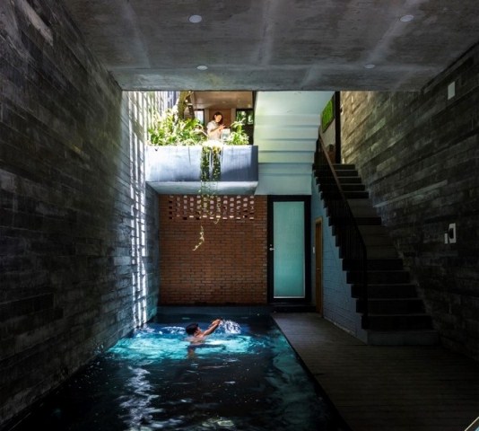 | Ở tầng 1 căn nhà có một bể bơi dài 9 m. Bể bơi này còn có tác dụng làm mát và điều hòa không khí. Bể bơi trong nhà nhưng vẫn ngập ánh nắng tự nhiên mang lại cảm giác thư thái và hòa mình vào thiên nhiên. |
