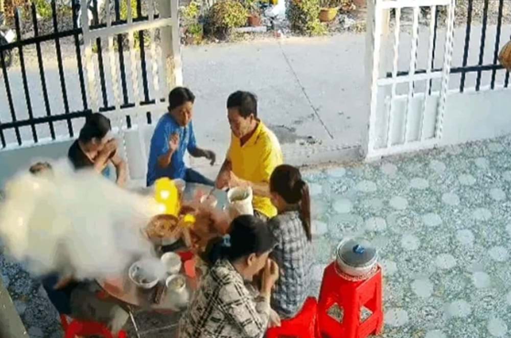 Sáu người dân ở Bạc Liêu quây quần ăn uống, bất ngờ bình gas mini đang dùng để nấu lẩu phát nổ như bom. Ảnh trích từ clip