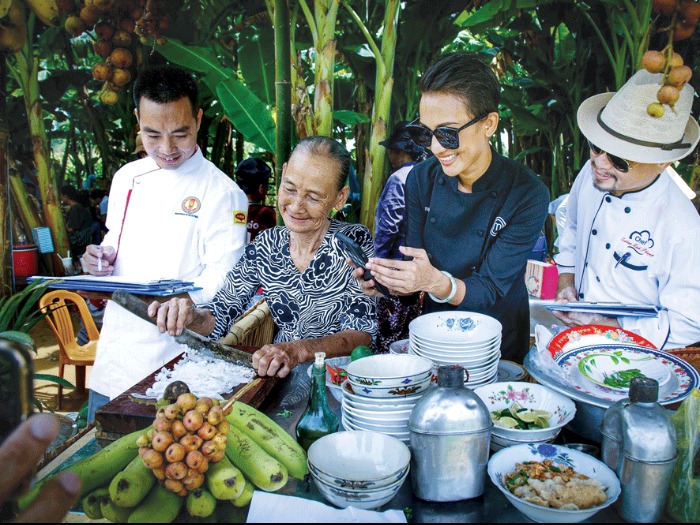 Cụ bà Trần Thị Thời với hơn 60 năm bán mì Quảng đang tạo con mì với sự chứng kiến của các đầu bếp trong nước và quốc tế. Ảnh: Lê Trọng Khang