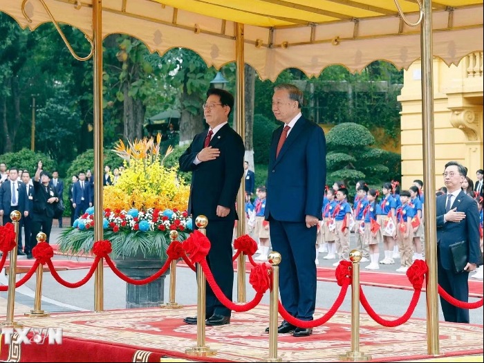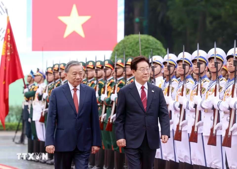 Tổng Bí thư, Chủ tịch nước Tô Lâm và Tổng thống Hàn Quốc Lee Jae Myung duyệt Đội danh dự Quân đội nhân dân Việt Nam. Ảnh: Thống Nhất/TTXVN