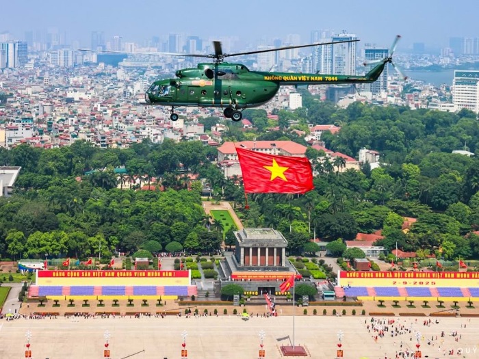 Biên đội trực thăng tiến hành huấn luyện bay treo cờ trên Quảng trường Ba Đình lúc 10g ngày 24.8 vừa qua, sẵn sàng cho nhiệm vụ bay chào mừng tại Lễ kỷ niệm 80 năm Cách mạng tháng Tám thành công và Quốc khánh 2.9. Ảnh: Quỷ Cốc Tử