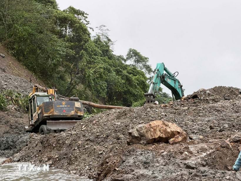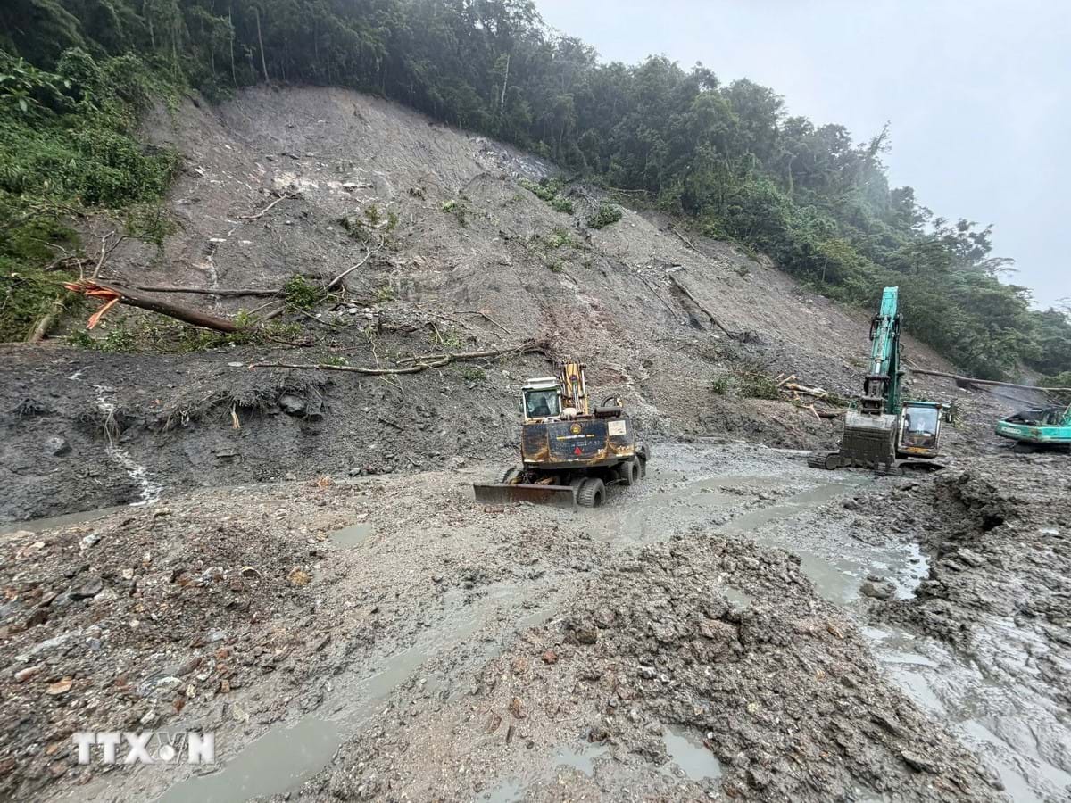Lực lượng chức năng khẩn trương khắc phục sạt lở tại vị trí Km1405-1408 đường Hồ Chí Minh, đoạn qua đèo Lò Xo. Ảnh: Cao Nguyên/TTXVN