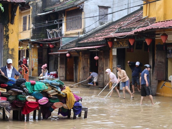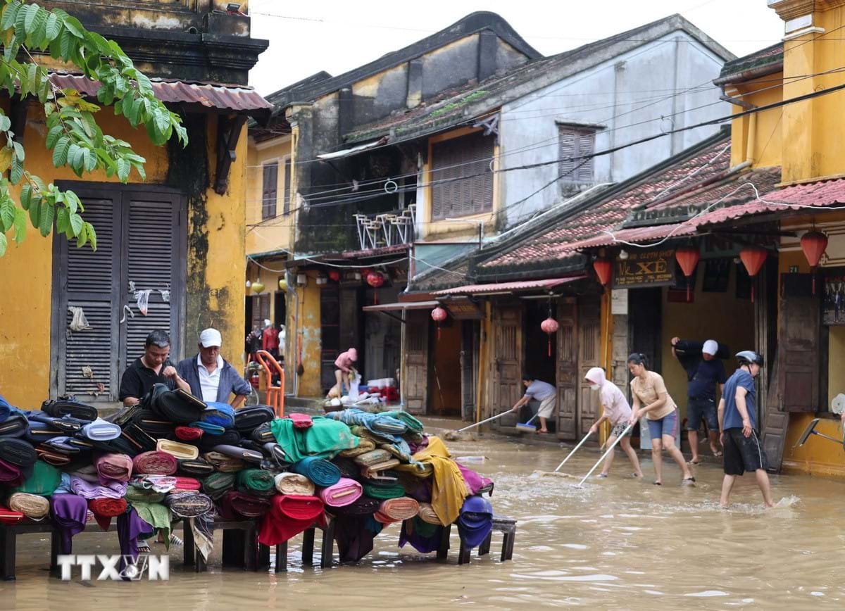 Người dân dọn bùn tại ngã tư Nguyễn Thái Học-Lê Lợi, phường Hội An. Ảnh: Kha Phạm/TTXVN