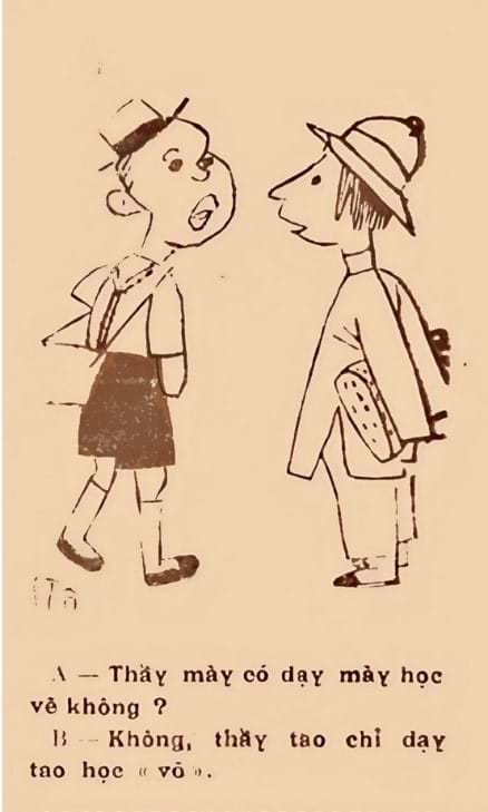 Bức phác thảo làm người viết liên tưởng đến bức tranh vui vẽ lại cuộc đối thoại của hai đứa trẻ đang trên đường đi học. Một cậu hỏi bạn: Thầy mày có dạy mày vẽ không? Cậu kia trả lời: Thầy tao chỉ dạy võ. Bộ dạng dáng vẻ trang phục và lứa tuổi khá giống với những đứa bé cầm cặp vẽ trong bức tranh của họa sĩ Victor Tardieu.