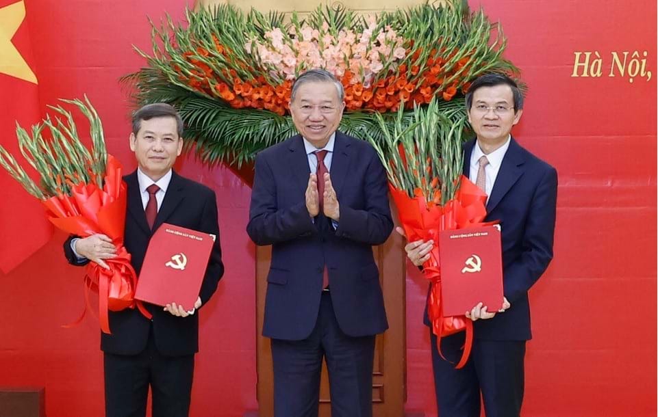 Tổng Bí thư Tô Lâm trao Quyết định của Bộ Chính trị cho các đồng chí Lê Minh Trí (bên trái) và Đoàn Minh Huấn (bên phải). Ảnh: Thống Nhất/TTXVN