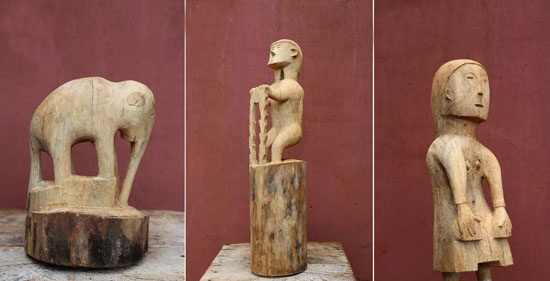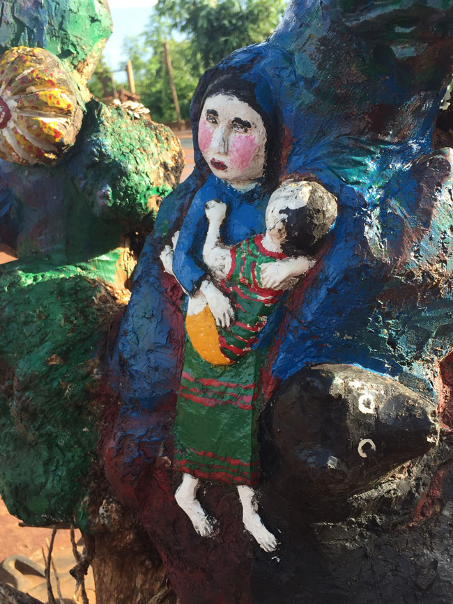 Cũng nên nói thêm điều này nữa về tượng nhà mồ Tây Nguyên. Hoàn toàn không có tượng chân dung người đã mất để mà tưởng nhớ, như bên Tây, hay bây giờ ở ta. Cũng không có tượng kẻ còn sống khóc thương người đã chết. Cũng có người bảo đấy là những hình nhân được gửi theo người chết để phục vụ người chết ở thế giới bên kia, tôi nghĩ chắc đấy là người Kinh muốn áp đặt văn hóa của mình cho người Tây Nguyên. Không, không hề có tất cả điều đó. Tượng nhà mồ Tây Nguyên rất vui. Cả một thế giới sống động và vui tươi. Đấy là cách người nghệ sĩ Tây Nguyên “làm ra’’ cái thế giới họ muốn, mà họ là Thượng đế sáng tạo. Hoặc đúng hơn, họ làm tượng vì, dẫu rất khiêm nhường, họ cũng được như Thượng đế “làm ra’’. Làm ra một thế giới, nhỏ thôi, mà là của họ, do họ, rậm rạp, xôn xao... Cho nên, điều quan trọng nhất đối với người nghệ sĩ Tây Nguyên không phải là kết quả của sự làm ra, mà chính là sự ‘’làm ra’’ đó. Có thế thì dẫu bị đẩy vào tình thế khốn khó đến đâu, họ vẫn là con người, mới là người. Còn tồn tại người.]