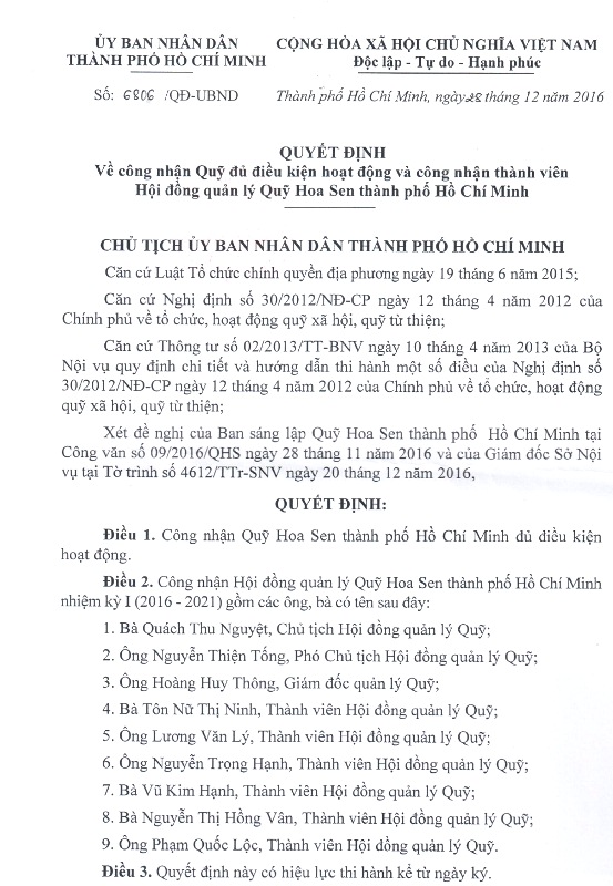Theo đó, UBND TP.HCM công nhận hội đồng quản lý Quỹ Hoa Sen nhiệm kỳ I (2016 - 2021) gồm 09 thành viên.