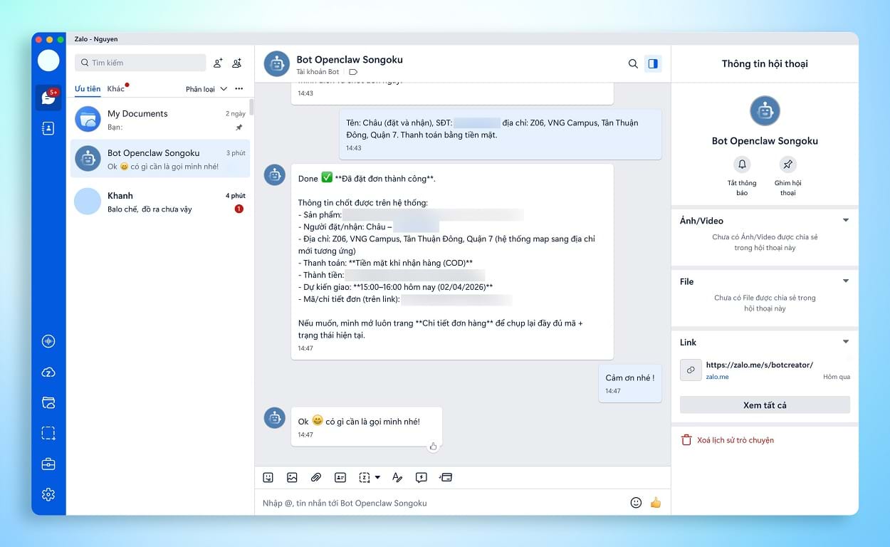 Theo công bố mới nhất của OpenClaw, Zalo hiện là một kênh kết nối chính thức, bên cạnh các ứng dụng nhắn tin quốc tế như Whatsapp, Telegram, Slack. Giờ đây, người dùng chỉ cần gửi tin nhắn qua Zalo để yêu cầu OpenClaw thực hiện công việc một cách nhanh chóng mà không cần chuyển ứng dụng.