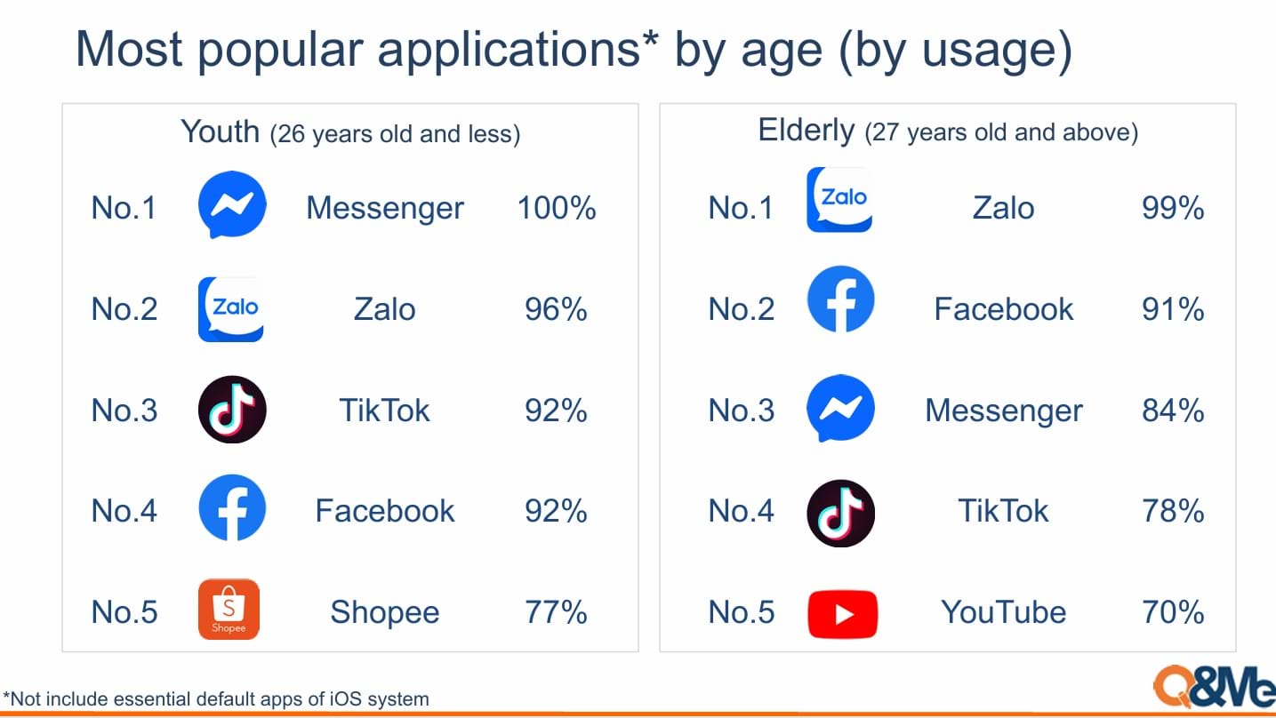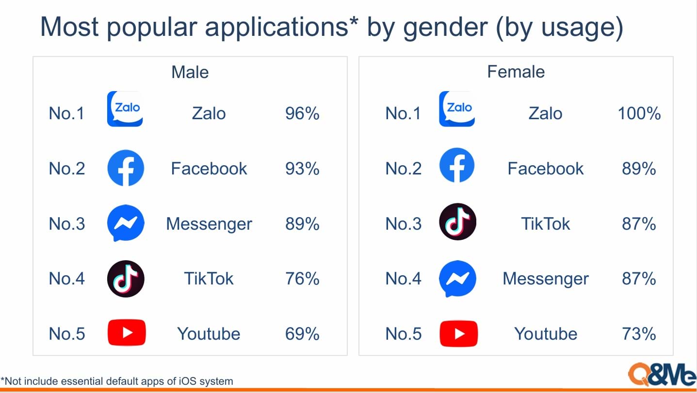 Điểm nhấn đáng chú ý trong báo cáo năm nay là sự ưu chuộng của phân khúc người dùng nữ dành cho “nền tảng quốc dân”. 100% người dùng nữ tham gia khảo sát cho biết ứng dụng di động được họ sử dụng nhiều nhất là Zalo. Các ứng dụng theo sau gồm Facebook (89%), TikTok (87%), Messenger (87%) và YouTube (73%).