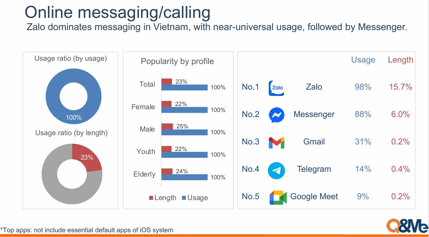 Ở hạng mục “nền tảng nhắn tin, gọi điện trực tuyến”, Zalo ghi nhận mức độ sử dụng đạt 98%, cao nhất trong các ứng dụng cùng nhóm. Không chỉ dẫn đầu về độ phủ, nền tảng này còn chiếm 15,7% tổng thời lượng sử dụng (length) trong nhóm ứng dụng nhắn tin/gọi điện, cao gấp 2 lần so với Messenger (6,0%).