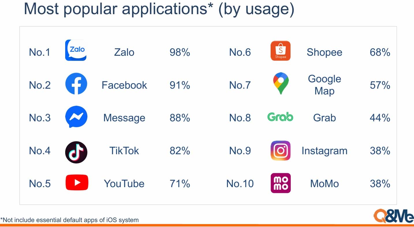 Cụ thể, ở hạng mục “Most popular applications by usage” (Tạm dịch: Các ứng dụng di động phổ biến nhất dựa trên lượng sử dụng), Zalo đứng đầu với tỷ lệ sử dụng đạt 98%, vượt qua các nền tảng quốc tế như Facebook (91%), Messenger (88%), TikTok (82%) và YouTube (71%).